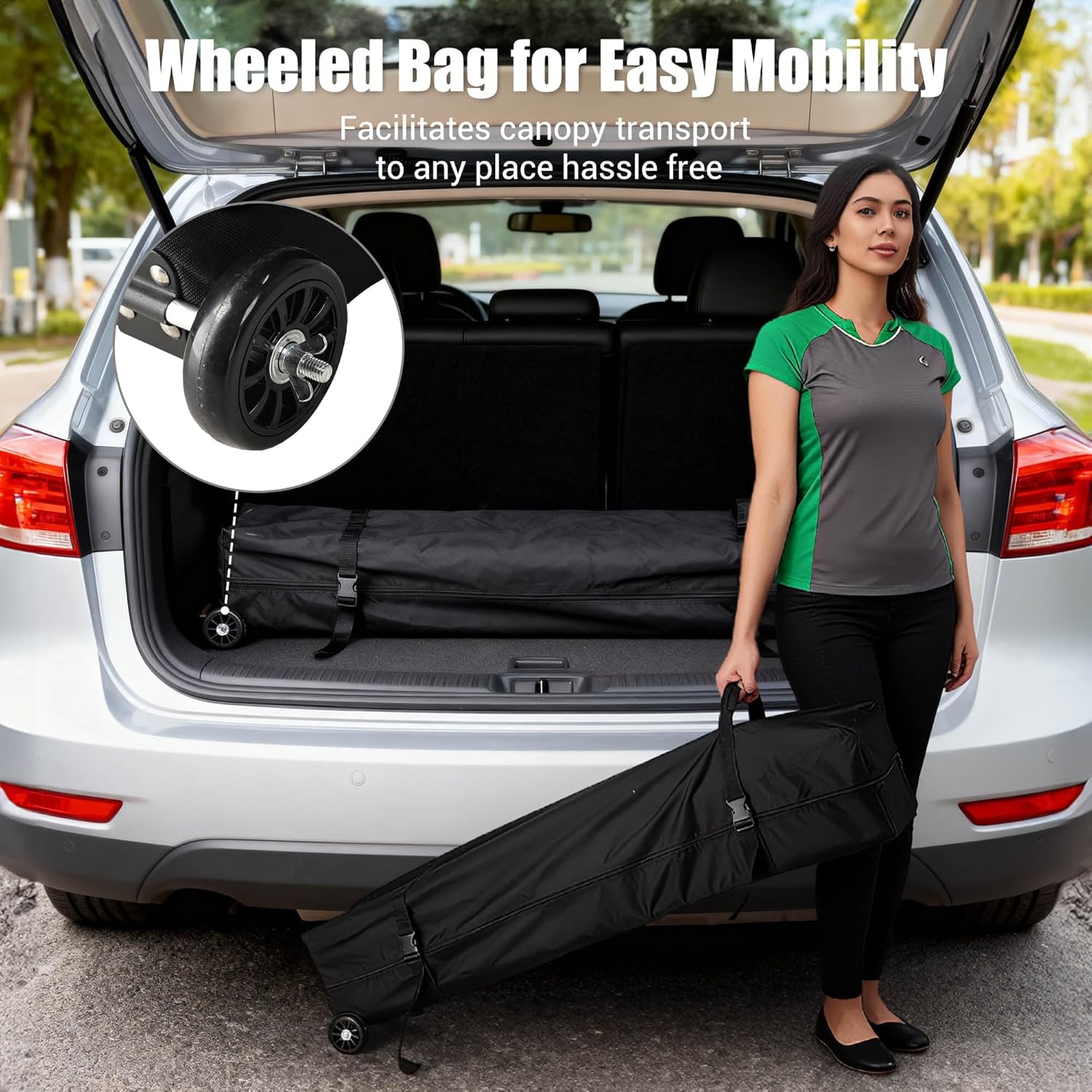 Wheeled Bag for Easy Transport – Designed for easy storage and transportation, the wheeled carry bag offers smooth mobility across any terrain, and its dedicated pockets for sandbags/stakes/ropes keep everything organized and ready for your next event