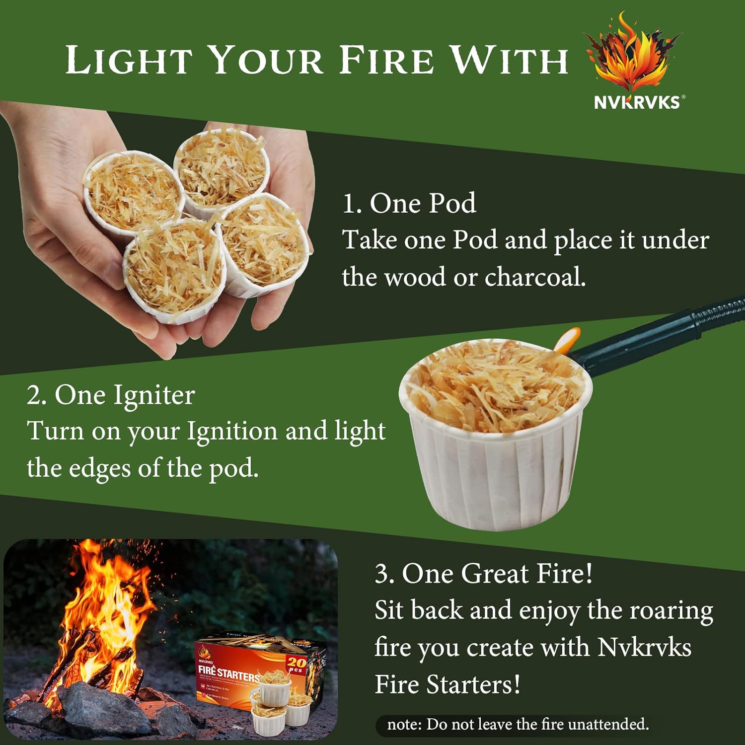 With 20 or 60 pods per pack, you’ll have plenty of fire-starting power to last you all season long! Our long lite fire starters for campfires are also easy to pack, transport & store, making them a convenient addition to your camping or hiking survival. Get your fire started in no time with Nvkrvks!