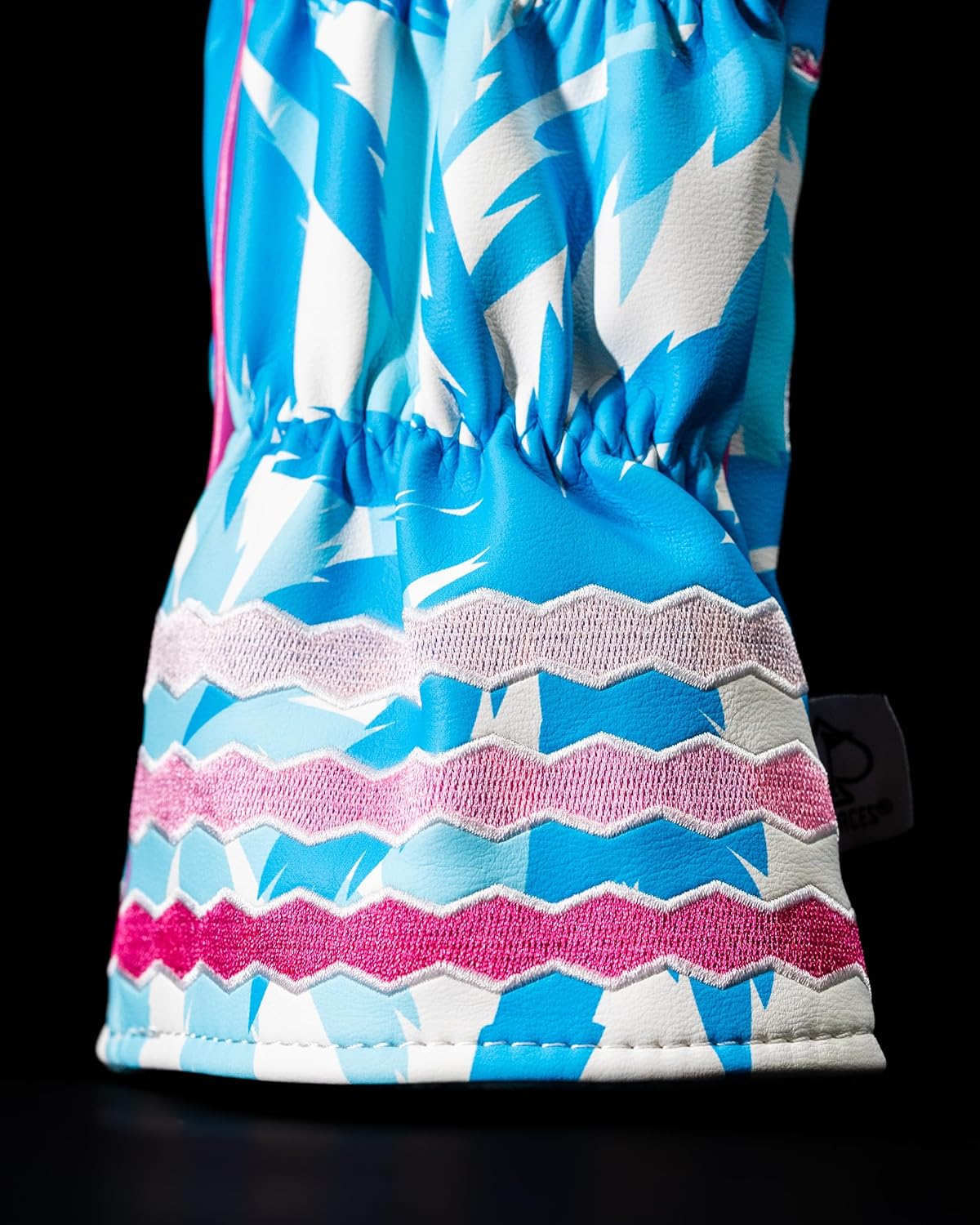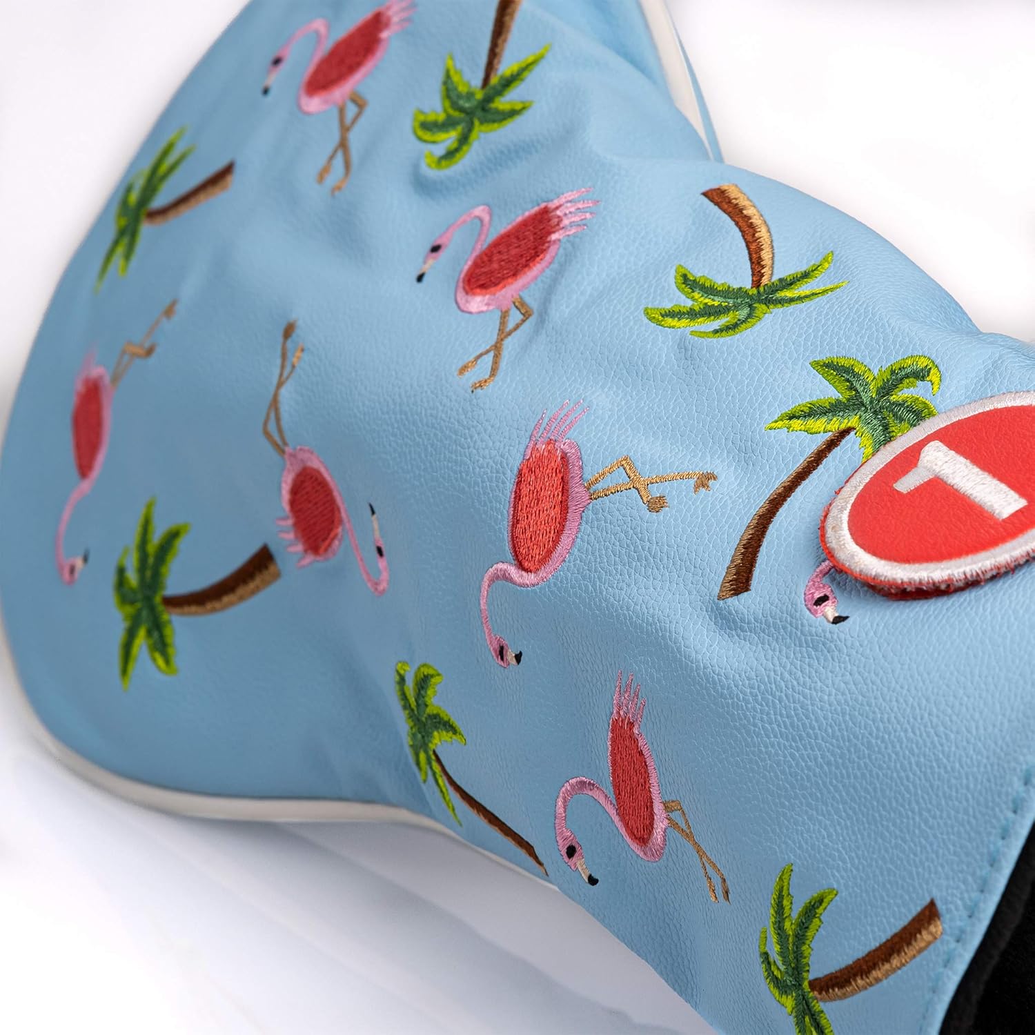MAKE YOUR GOLF BAG FUN AND STAND OUT – Embroidered palm tree and lawn flamingo tropical inspired design with sewn leather light blue panels is the perfect way to make your golf bag stand out among other head covers for golf clubs.