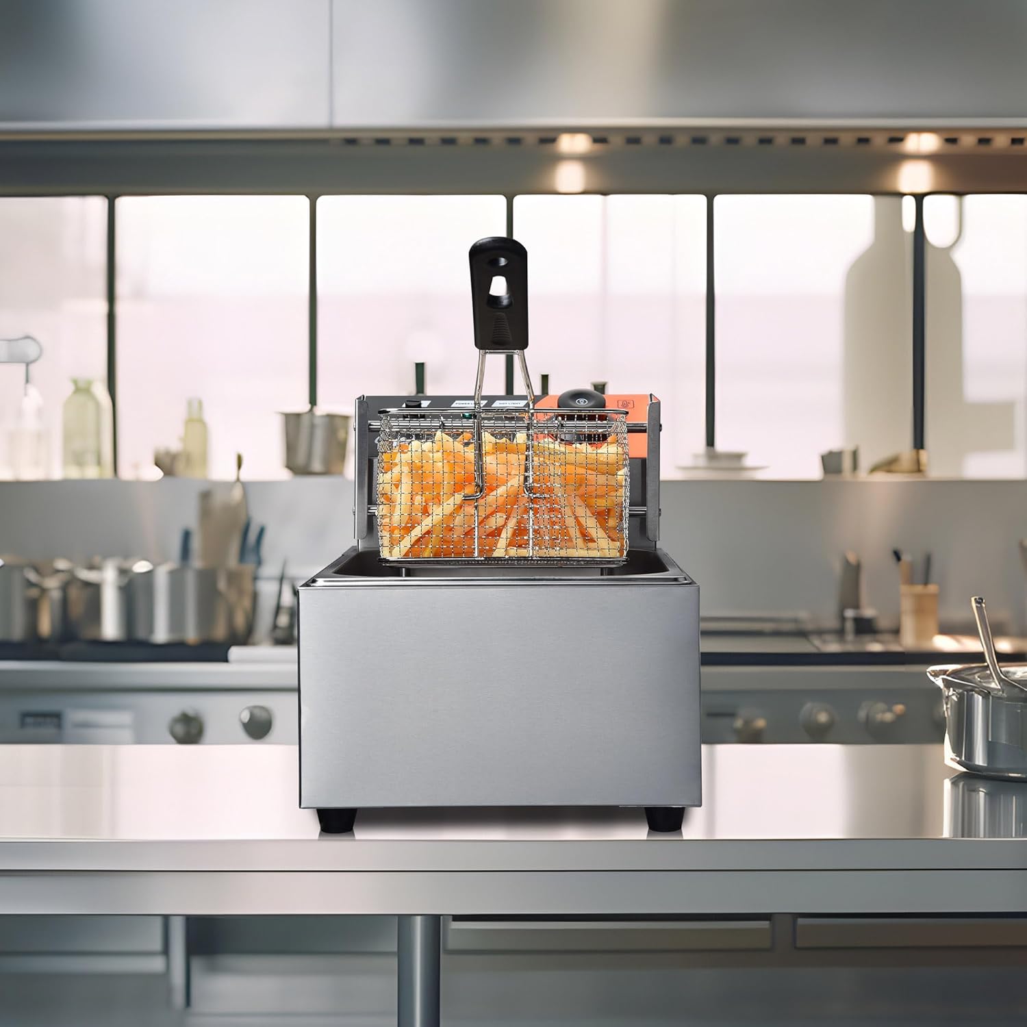 8L Commercial Electric Countertop Deep Fryer with Basket Residue Plate Lid Automatic Temperature Control, 2500W Single Tanks Restaurant Home Kitchen Equipment