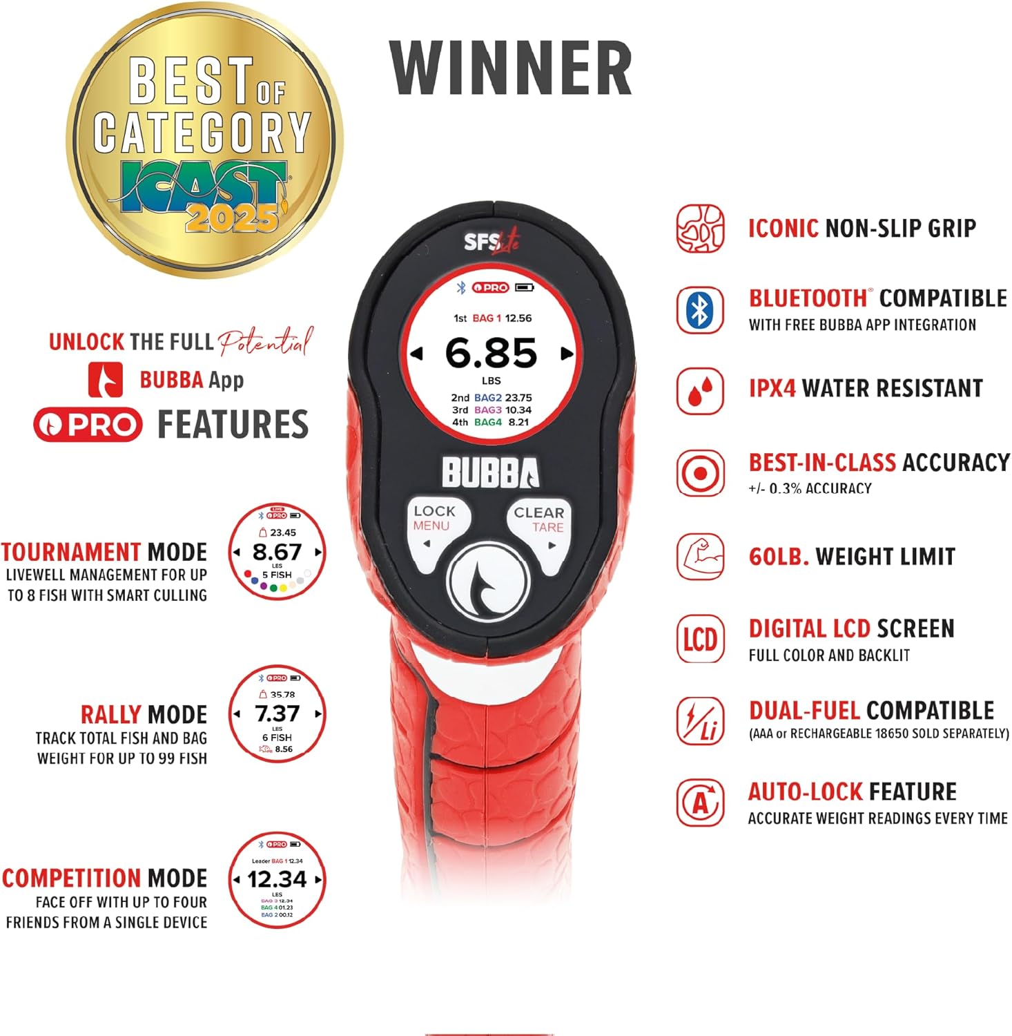 VERSATILE: Supports up to 60 lbs with precision (+/- 0.3%) and multiple fishing modes (Tournament, Rally, Competition) via the Pro BUBBA App.