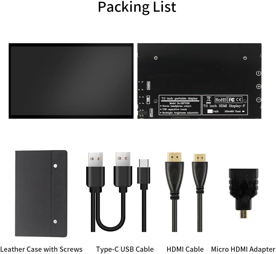 Package List: 1 x 7 inch screen 1 x Leather stand 2 x Screws 1 x HDMI to Mini HDMI cable 1 x Micro HDMI to HDMI Adpater 1 x Dual Type-A to Type-C