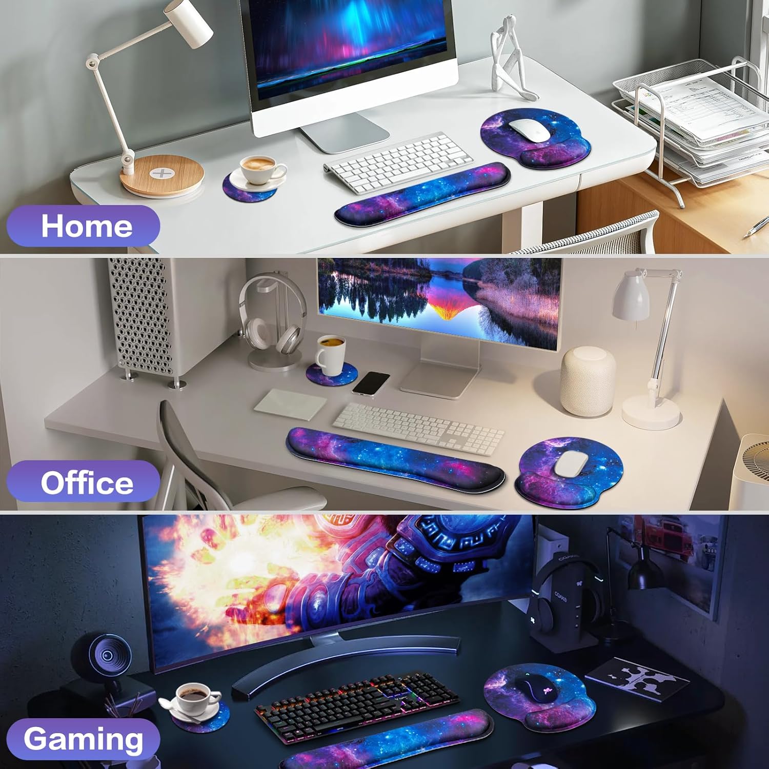 Desk Pad Galaxy, Mouse Pad with Wrist Rest Set, 3-in-1 Wrist Support Mousepad Set, Gaming Mat Pad with Anti-Skid Base,Ergonomic Memory Foam Keyboard Gel Wrist Rest, Office Desk Accessories