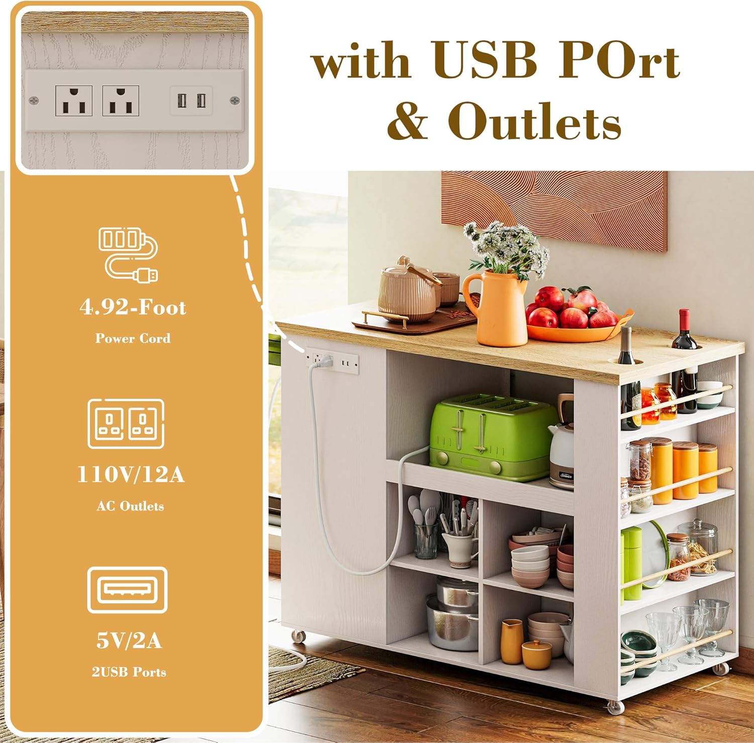 CONVENIENT Device -This kitchen shelf comes with a power outlet, 2 AC and 2 USBs, which makes everything more convenient.