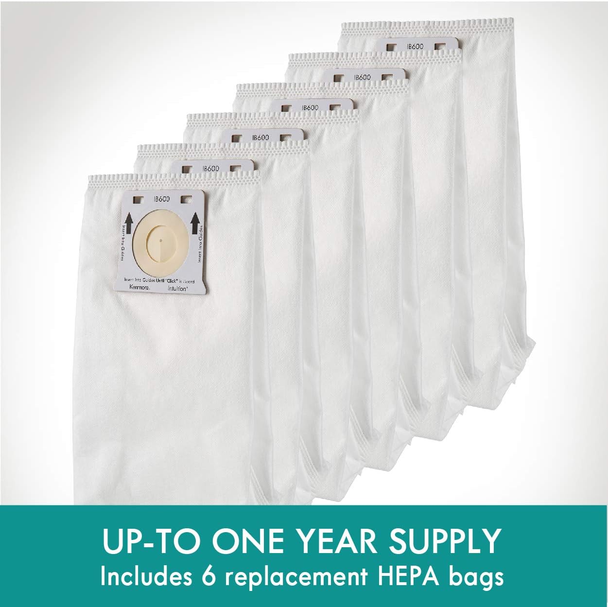 Kenmore IB600 bags provide HEPA filtration for Intuition vacuums with No-Touch™ bag technology. This package of Kenmore HEPA vacuum bags contains 6 replacement vacuum bags for select Kenmore upright vacuum cleaners. HEPA Media Filtration captures 99.97% of particles of dust, pollen, pet dander, mold and bacteria, removing allergens, irritants and pollutants down to 0.3 micron.
