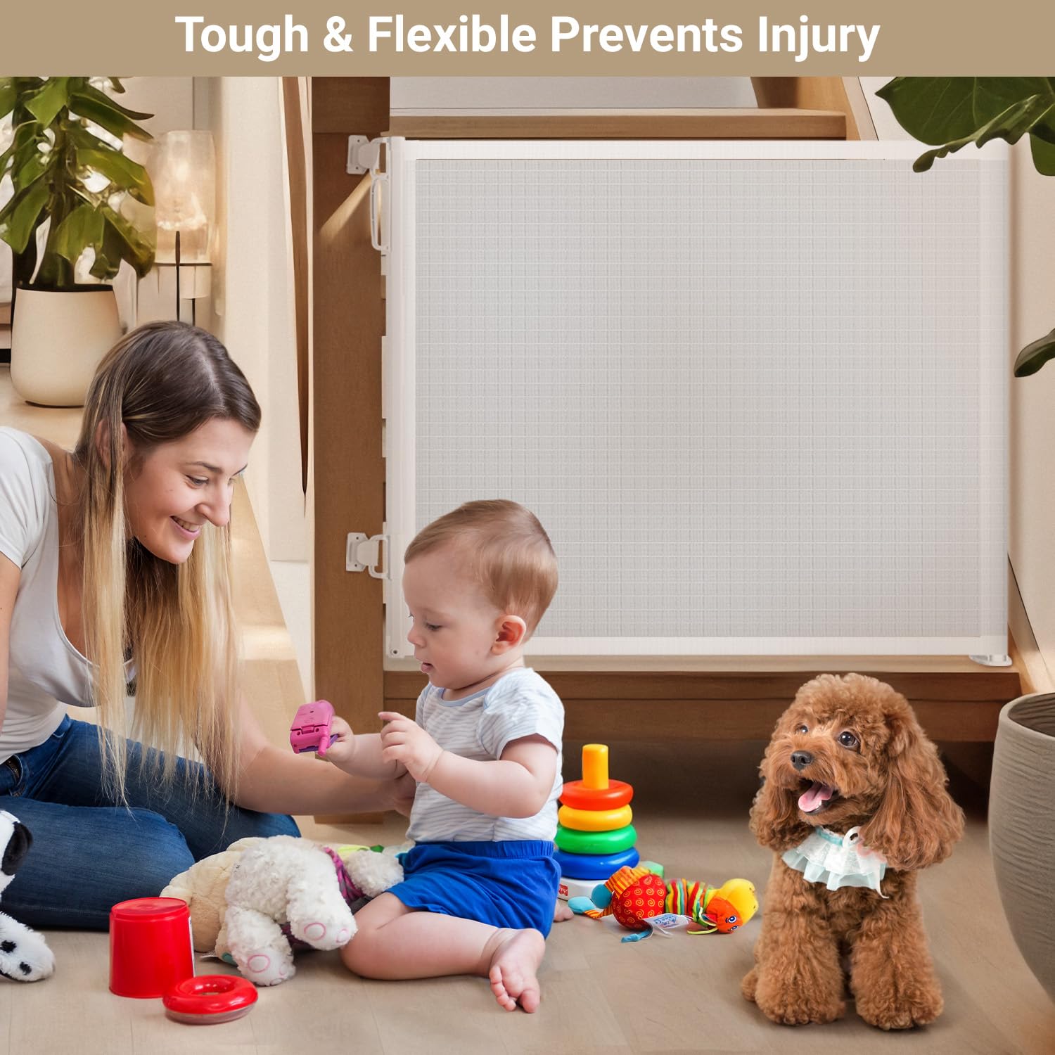 Versatile and Portable- Our retractable gate is built with durable, soft mesh and comes with complete accessories for easy installation. It can be effortlessly moved and removed from one set of mounting hardware to another, providing maximum flexibility