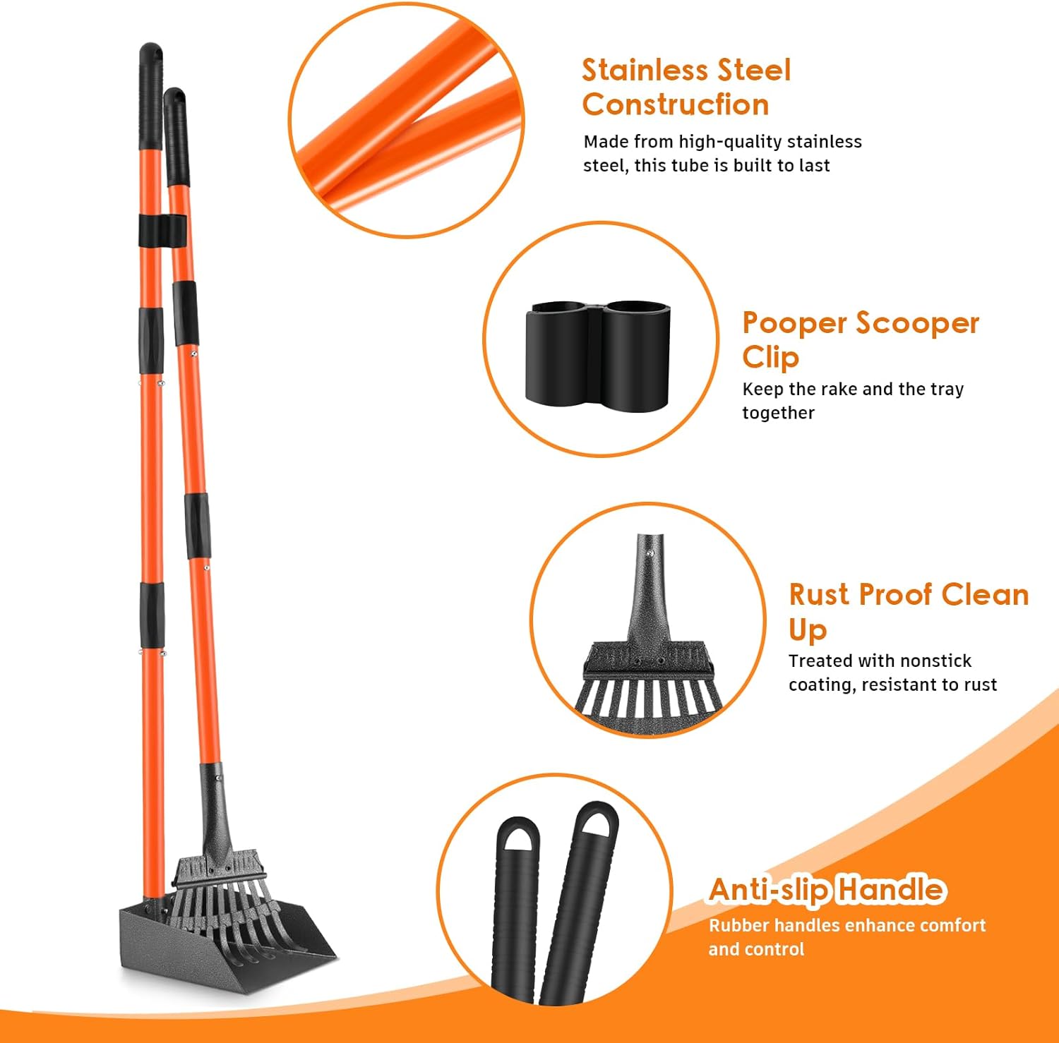 Pooper Scooper, Long Handle Dog Pooper Scooper for Medium Small Dogs Heavy Duty, Pet Supplies Stainless Metal Tray and Rake Set, Use on Grass, Dirt or Gravel