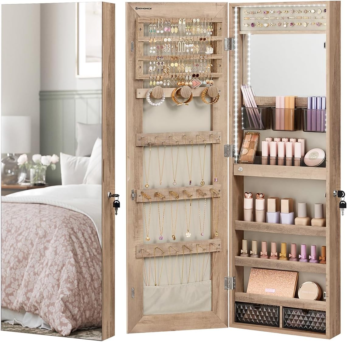 [Cabinet and Mirror, 2 in 1] 36 necklace hooks, 3 bracelet rods, 72 earring slots, 24 stud earring holes, 39 ring slots, 3 shelves, and 2 drawers keep all your jewels and makeup organized. The full-length mirror? It allows you to check from head to toe