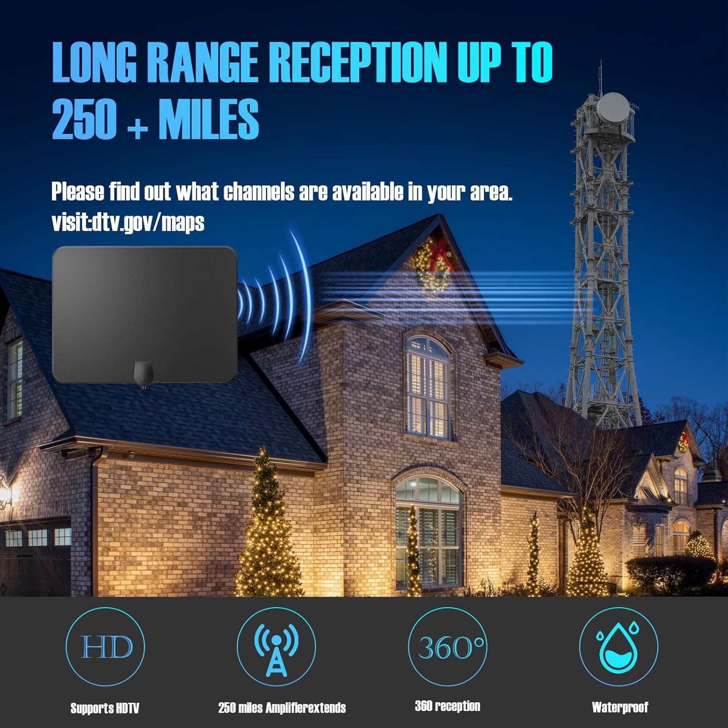 【Will It Work in My Area? 250-Mile Range Explained】 With its built-in signal amplifier, this antenna pulls in signals from towers up to 250 miles away. For best results: 1) Visit DTV Reception Maps online to check your local tower distance. 2) Place the antenna near a window or exterior wall. The amplifier ensures you get the strongest possible signal for your location.