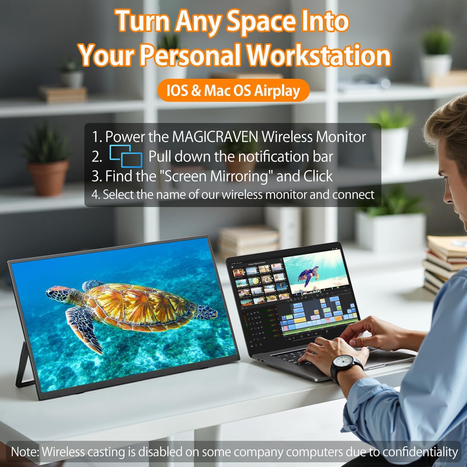 Wireless Portable Monitor for Laptop, 18.5″ Portable Monitor with Battery-1080P FHD Second Screen for Home & Office, AirPlay & Miracast Casting, No Cables or Drivers Needed